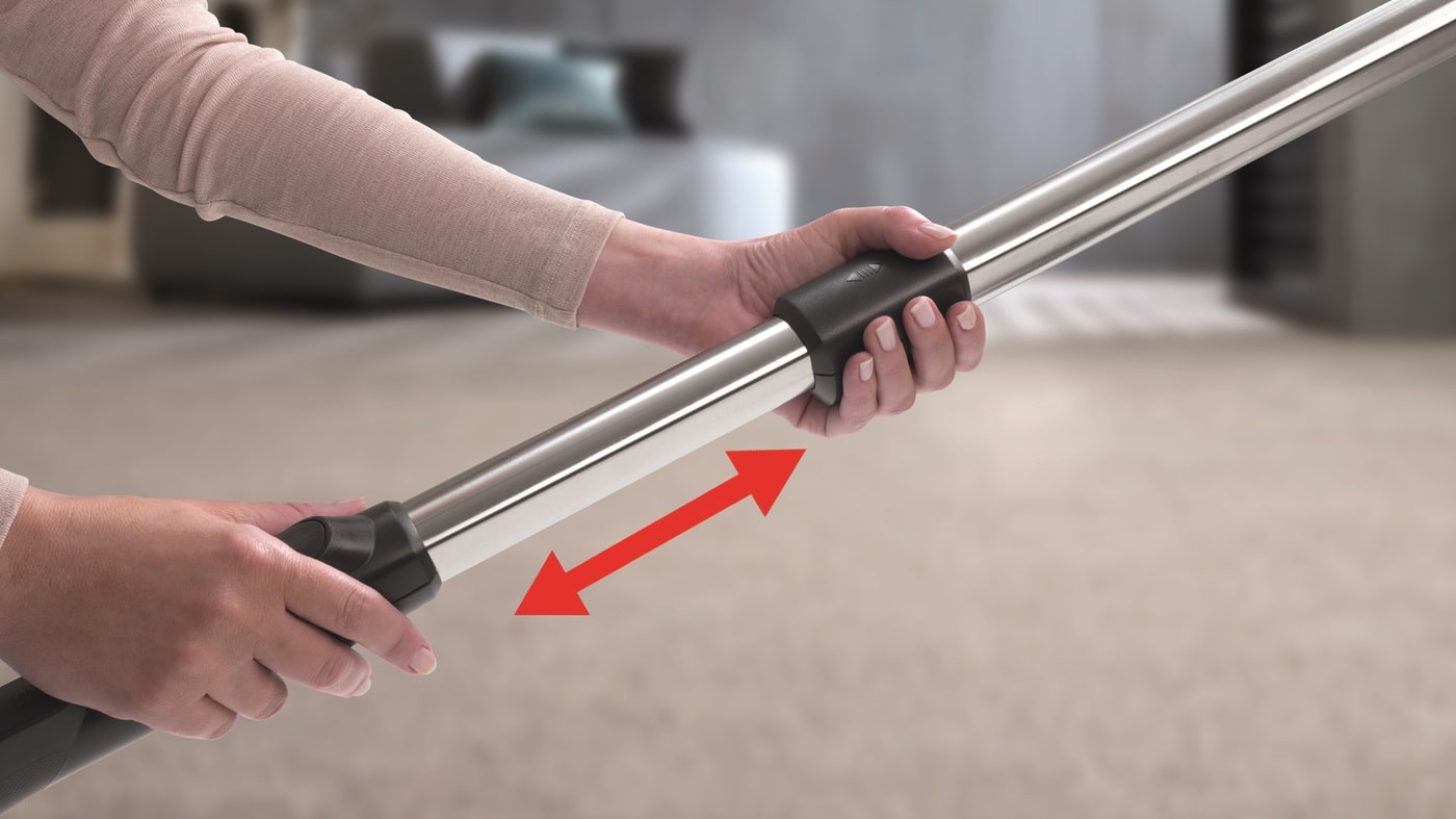 Þú getur stillt Compact stálrörið þannig að ryksugun fari fram í nákvæmlega þeirri vinnuhæð sem þér hentar. Þægilegt er að stytta og lengja stálrörið og það læsist á öruggan hátt með greinilegum smelli í þeirri hæðarstillingu sem valin er. Stækkun stálrörsins eykur magn loftflæðis um ryksuguna og styður þar með við frábær þrif. Gúmmí lag sem er á efri enda Comfort compact stálrörsins er mjög praktískt, rörið rennur t.d. ekki niður ef því er hallað upp að vegg.