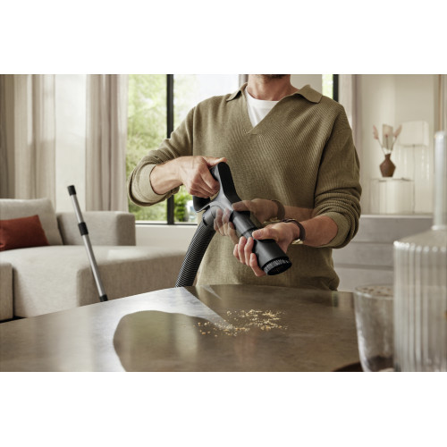 Miele Guard L1 er með innbyggðum 2-in-1 stúti sem gerir þér kleift að skipta hratt og auðveldlega á milli verkefna. Stúturinn sameinar sérstaklega breiðan áklæðabursta sem hentar fyrir þrif á áklæðum og kverkastút sem er hannaður fyrir þrif á svæðum sem erfitt er að ná til. Stúturinn er staðsettur í aftari hluta ryksugunnar og því alltaf við höndina.
