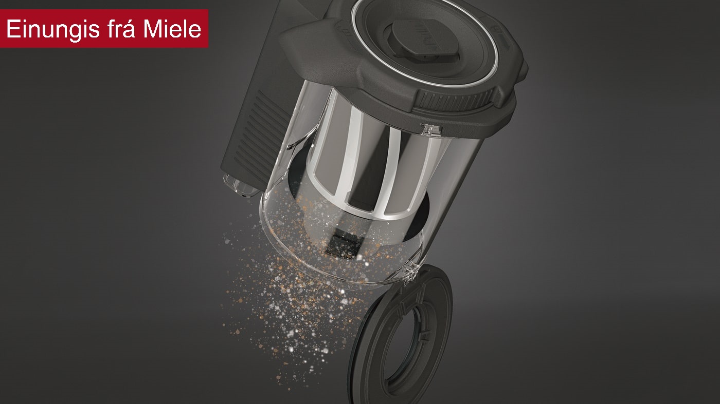 Er tankurinn fyrir ryk á Miele Triflex skaftryksugunni fullur? Twist2open eiginleiki gerir þér kleift að opna hann á einfaldan hátt – með einum snúningi. Tankurinn opnast strax og þú getur losað rykið á þægilegan máta ofan í ruslafötu.