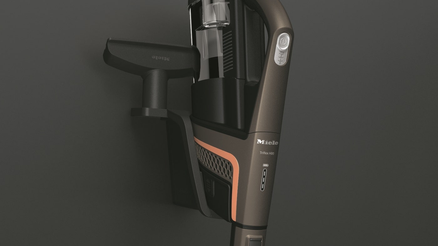 Þægileg veggfesting gerir þér kleift að geyma Miele Triflex skaftryksuguna á veggnum ásamt setti af þremur ryksuguburstum sem fylgja með tækinu; húsgagnabursta, áklæðabursta og kverkaspíss. Þetta sparar pláss sem þar af leiðandi er mögulegt að nýta undir aðra hluti.