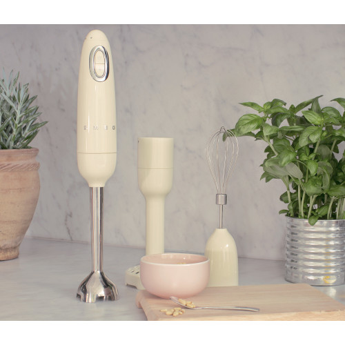 Smeg 50´s töfrasprotinn er fjölhæfur og frábær fyrir alls kyns matvinnslu. Þeytari, grænmetismaukari, söxunarskál og blöndunarskál fylgja með töfraprotanum sem gera þér kleift að búa til smoothie og súpur, mylja klaka, þeyta rjóma – nefndu það!