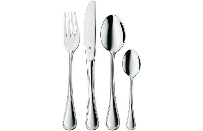 Glitrandi CONTOUR línan frá WMF notar mjúklega bogadregnar línur til að setja glæsilega áherslur í hvaða tilefni sem er. Hvort sem um er að ræða glæsilegan morgunverð eða hátíðarveislur, þá fellur hin einfalda en hefðbundna hönnun óaðfinnanlega inn í hvaða borðhald sem er. Fín yfirborðsstimplunin gefur samstæðunni einnig glæsilegan glans. Tilfinningin í settinu eykur einnig matargleðina fyrir gestina þína: mjó handföng hvers hlutar liggja mjúklega í hendinni, á meðan vel jafnvægisstilling halda hnífapörunum stöðugum.