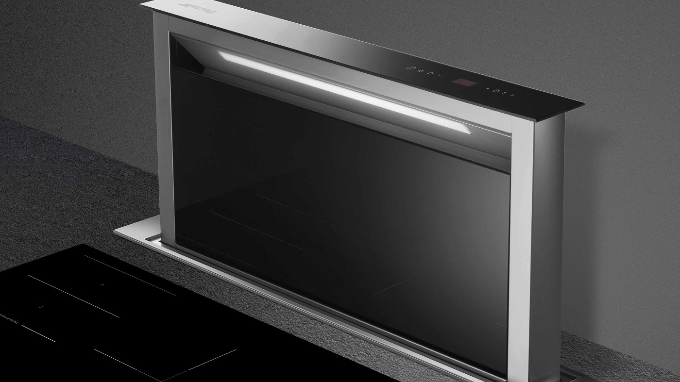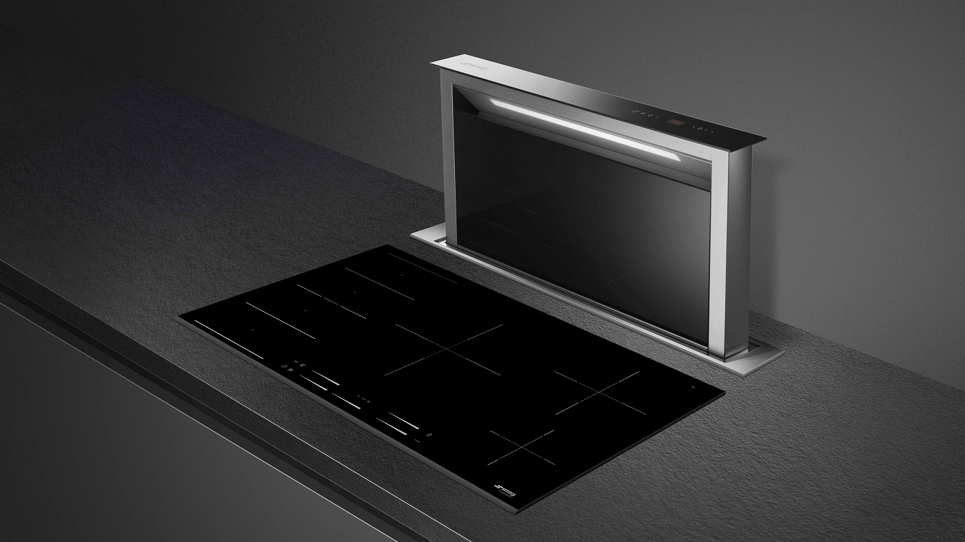 Klassísk 90 cm breið borðvifta frá Smeg. Borðviftan er með hlutlaust útlit og sérstaklega hönnuð til þess að passa við fjölbreytt úrval eldhústækja